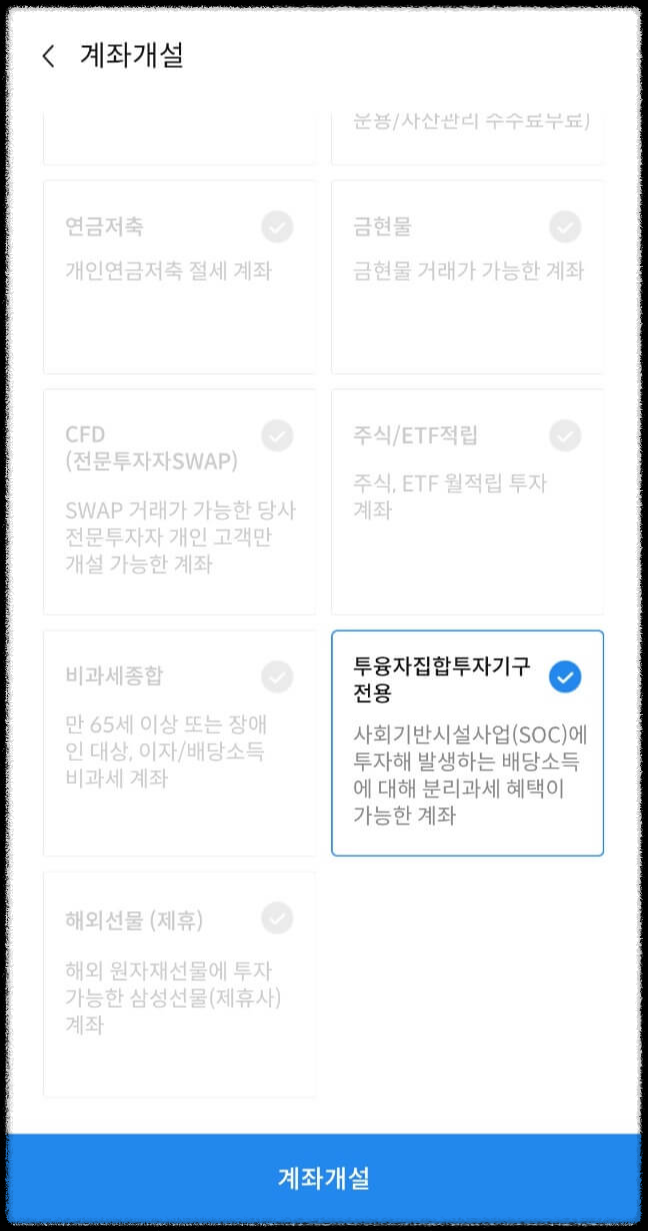 | MPOP ▶ 안내/계좌개설 ▶ 계좌개설/인증 ▶ 계좌개설 ▶ 투융자집합투자기구 전용 선택 |