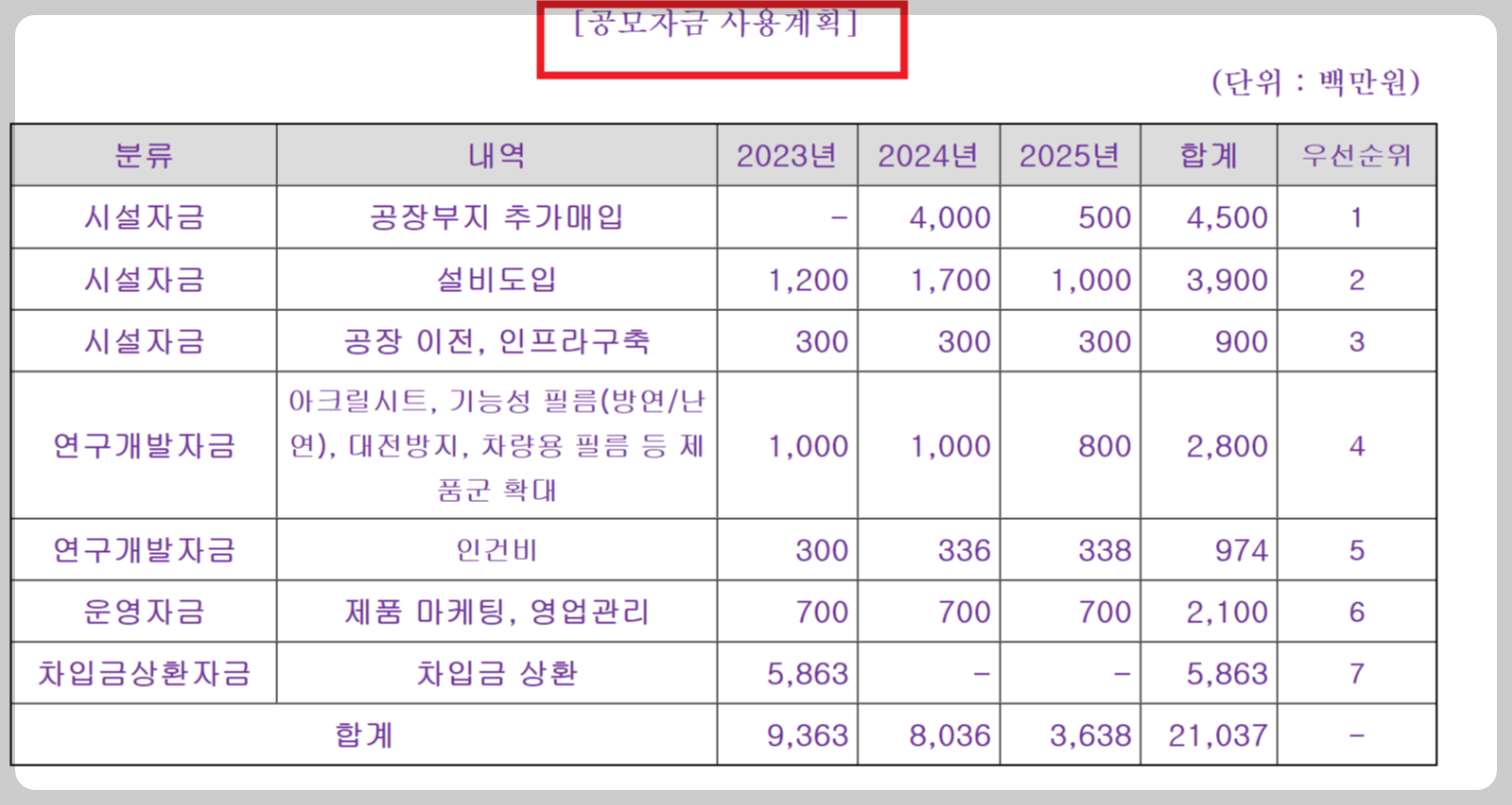 공모주 청약으로 벌어들인 자금은 시설자금, 운영자금, 연구개발자금 순으로 먼저 사용하고 , 차입금 상환 자금으로도 사용할 예정이라고 합니다.