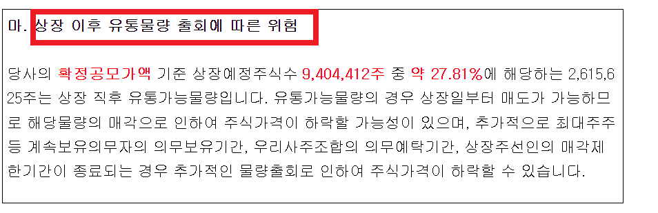 상장 후 유통가능 물량은 2,615,625주(889억 원)로 27,81%에 해당이 됩니다. 유통가능 물량은 상장일 포함 매도 가능하기 때문에 매각물량으로 인한 주식가격 하락 가능성, 의무보유기간 등으로 주식가격이 하락할 수도 있습니다.