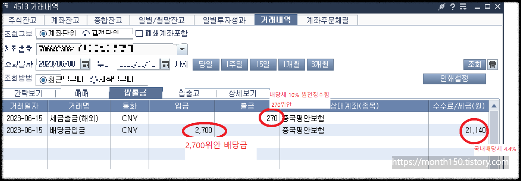 세 번째 빨간 박스는 "외화후예수금" 2,700위안은 이번에 평안보험 배당으로 결정된 금액입니다.