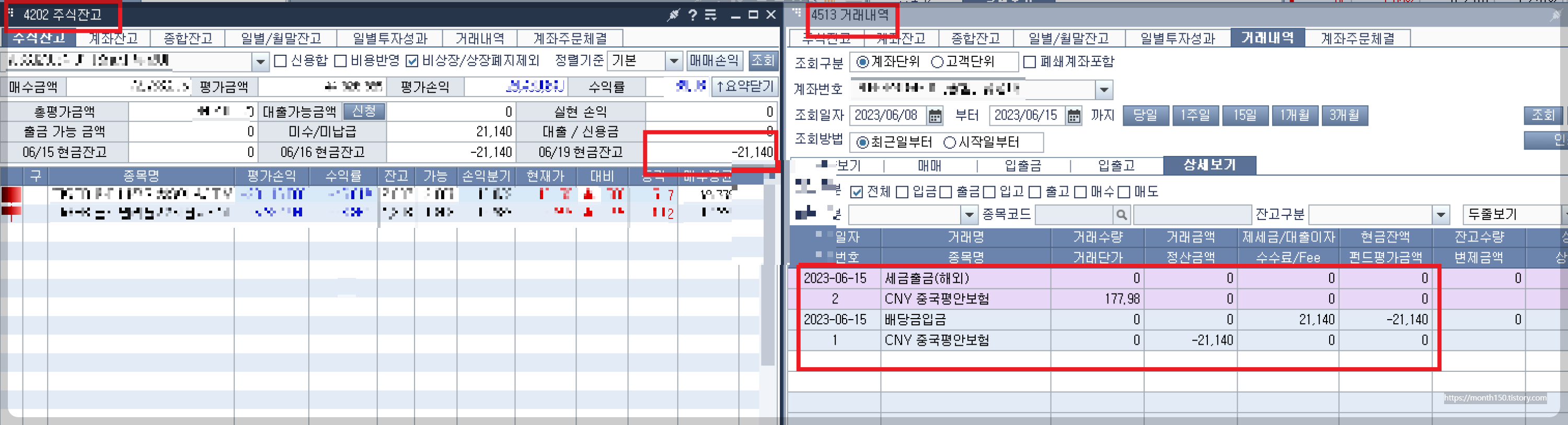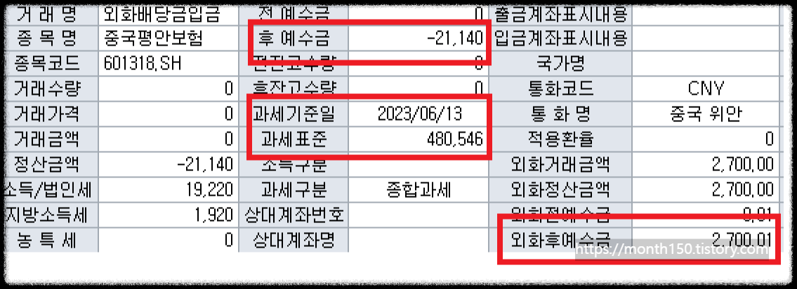 두 번째 빨간 박스는 "과세기준일" 2023/06/13일 배당일이며, "과세표준"은 평안보험 배당금 2,700위안을 원화로 환산하여 480,540원으로 확인됩니다.