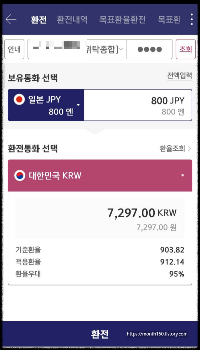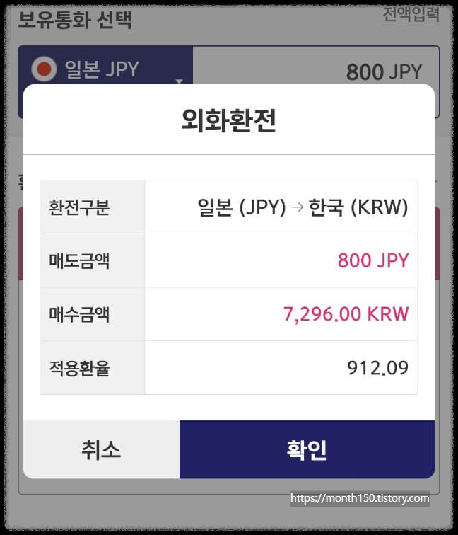메뉴 ▶뱅킹/업무 ▶ 뱅킹/환전 ▶ 환전 ▶ 보유통화선택(일본 JYP 엔화) ▶ 환전통화(원화) 입력 ▶ 환전클릭