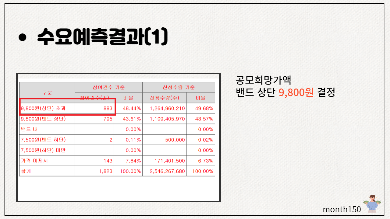 수요예측 결과를 확인해 보겠습니다. 공모확정가액은 밴드 최상단에 가장 많은 참여건수 883건으로 자연스럽게 9,800원으로 결정되었습니다.