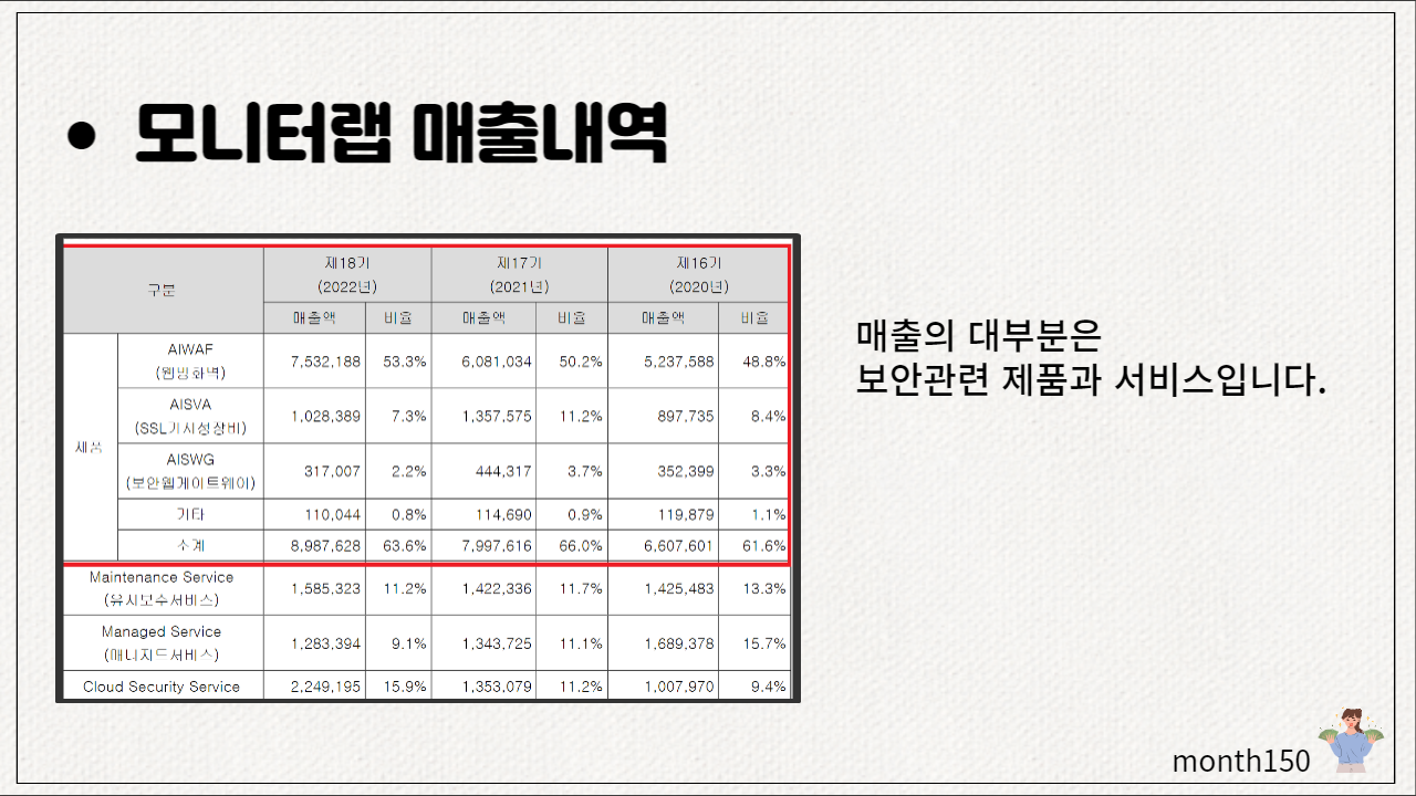 보안관련 제품과 서비스에 대한 매출이 가장 높은 비중을 차지하고 있습니다. AIWAF라는 웹 방화벽제품은 내부 사용자가 외부 인터넷 구간을 접속할 때 웹서버에 대해 필요한 보안을 제공하고 있습니다.